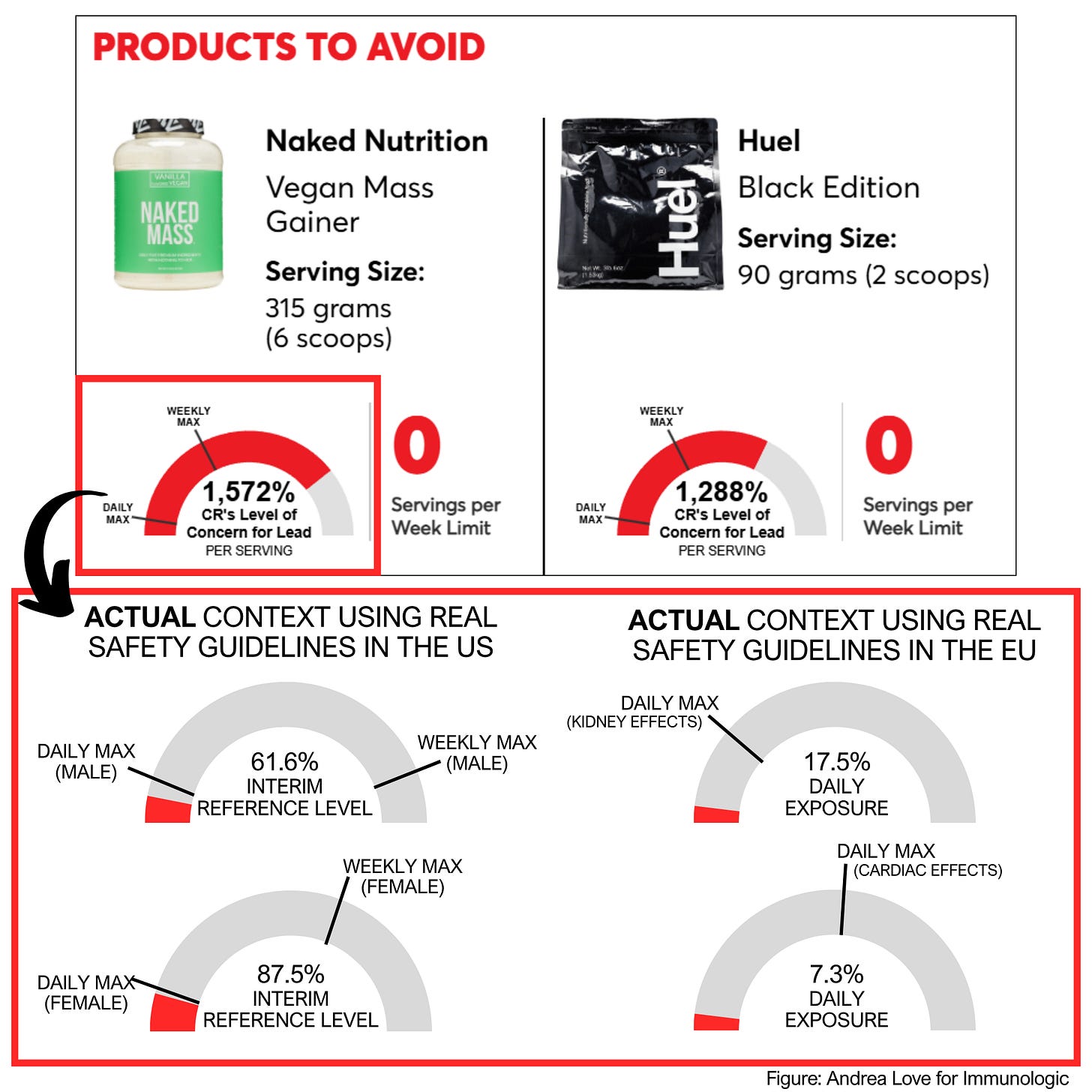Consumer Reports is at it again, this time, fear-mongering about lead in protein powders. Their latest headline and “report” concludes that various protein powders are filled with harmful levels of lead, and they use scary-looking graphics with percentages above 1000, to evoke that health anxiety they are so good at.