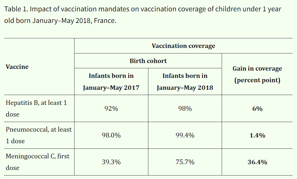 In 2018, France proved this. Up till then, there were only requirements for diphtheria, pertussis, and poliomyelitis (DT and IPV), and France had one of the highest rates of vaccine hesitancy in the world. On January 1, 2018, they expanded mandates to include vaccines to protect against 8 additional diseases: Haemophilus influenzae type B (Hib), Pertussis, Hepatitis B, Measles, Mumps, Rubella (MMR), Meningococcus C, and Streptococcus pneumoniae.